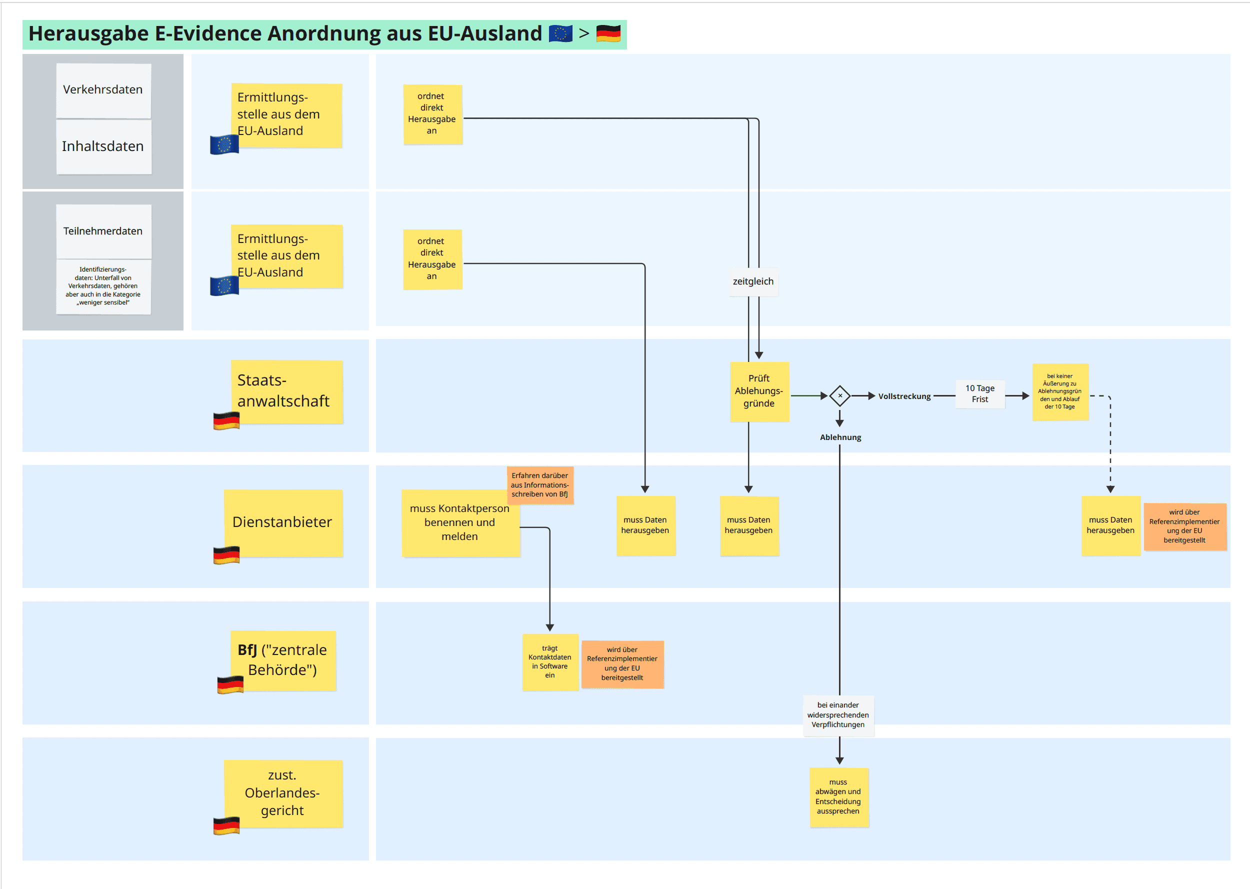 - Verdeutlicht die notwendigen Interaktionen zwischen Justizbehörden und privaten Dienstanbietern im grenzüberschreitenden Kontext.